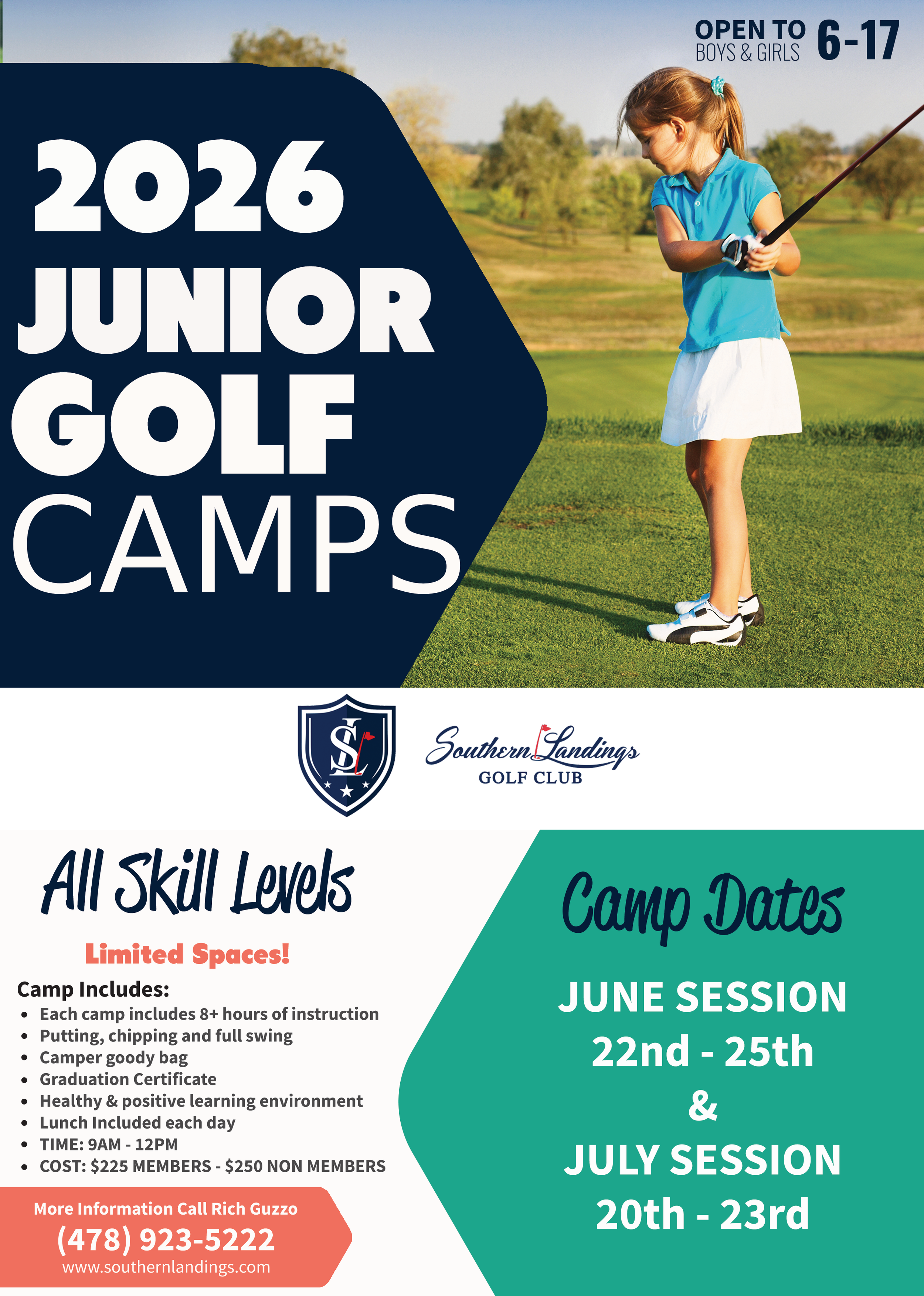 Our 2026 Junior Golf Camps at Southern Landings are designed to introduce and develop young golfers of all skill levels in a fun, positive, and engaging environment. Each camp includes over 8 hours of instruction covering putting, chipping, and full swing fundamentals, along with on-course learning opportunities. Campers will receive a goodie bag, lunch each day, and a graduation certificate to celebrate their progress. Two sessions are available, June 22-25 and July 20-23 from 9am to 12pm. Space is limited, so we encourage early registration to secure a spot. For more information or to register, please contact the pro shop.