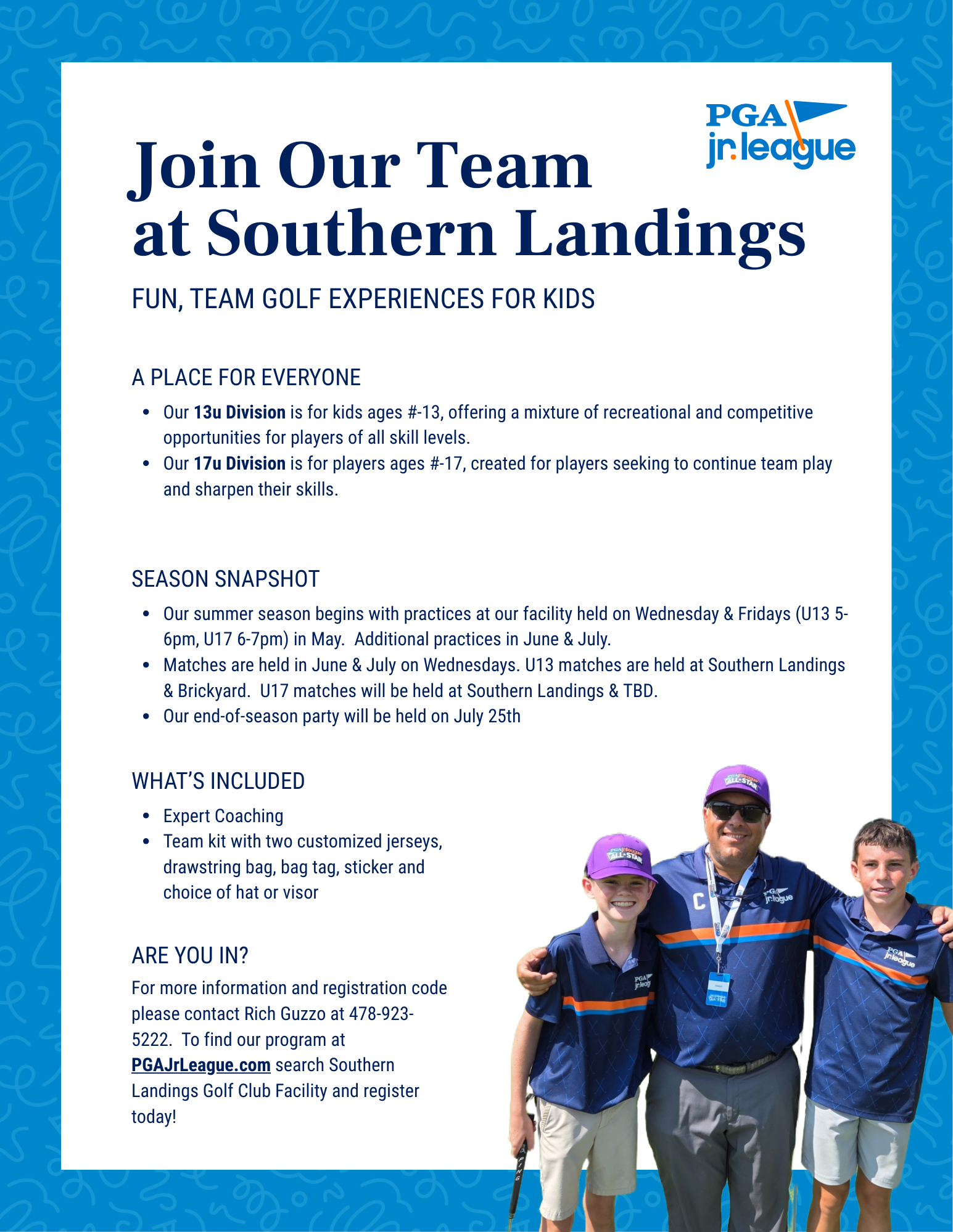 U17: https://www.pgajrleague.com/junior-league-events/ccb04c88-aa91-446f-bf05-4c3a40e5db56A registration code is required prior to signing up. Please contact the pro shop or reach out to Rich Guzzo to receive your code and ensure your junior is a good fit for the program.